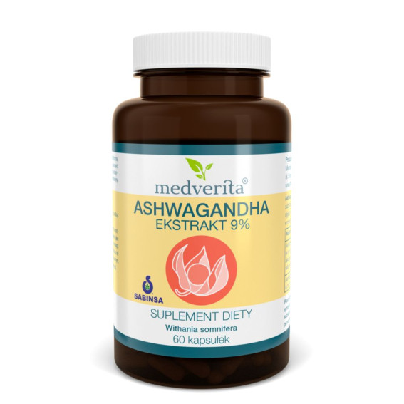 Ashwagandha Medverita 9% 60 kaps to suplement diety zawierający standaryzowany ekstrakt z korzenia witanii ospałej (Withania somnifera), znanej również jako ashwagandha lub indyjski żeń-szeń. Roślina ta jest źródłem wielu naturalnie występujących substancji biologicznie czynnych, dlatego ekstrakt z jej korzenia jest często wykorzystywany w suplementach diety o wysokiej jakości.