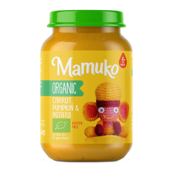 BIO Obiadek Mamuko marchew-dynia-ziemniak to warzywna kompozycja stworzona z myślą o niemowlętach po 6. miesiącu życia. Produkt powstał na bazie starannie wyselekcjonowanych składników pochodzących z certyfikowanych upraw ekologicznych. Łączy w sobie lekkostrawne warzywa: marchew, dynię i ziemniaki, które wspierają prawidłowy rozwój i dostarczają cennych składników odżywczych.