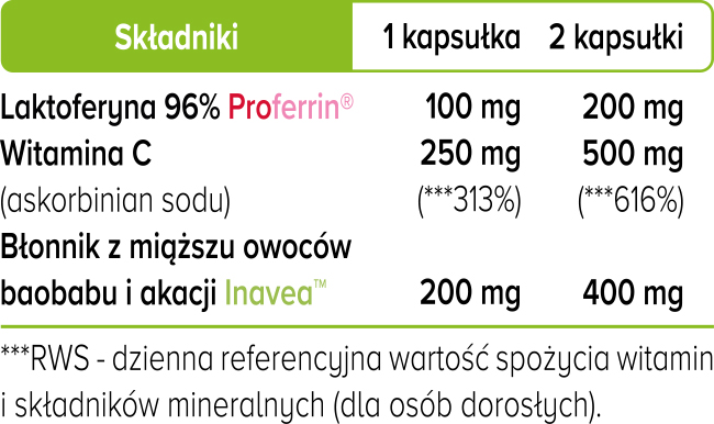 Składniki: Bioferrin®️ Laktoferyna 96% (z mleka) 200 mg, Witamina C (askorbinian sodu) 200 mg, Inavea™️ błonnik z baobabu i akacji 200 mg, kapsułka: hydroksypropylometyloceluloza