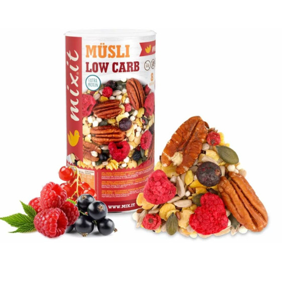 Składniki: płatki sojowe 37%, orzechy pekan 20%, pestki dyni 10%, siemię lniane 10%, nasiona słonecznika 10%, serwatkowe crispies 5%, liofilizowana czarna porzeczka 3%, liofilizowana czerwona porzeczka 3%, liofilizowane maliny 2%