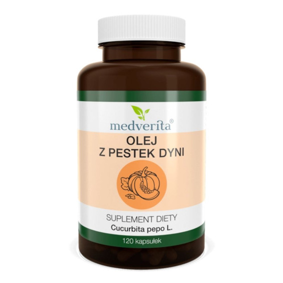 Dynia zwyczajna jest od wieków ceniona w medycynie naturalnej, jej miąższ i pestki stanowią naturalne źródło cennych składników odżywczych. Olej z pestek dyni Medverita to suplement diety w kapsułkach, zawierający zimnotłoczony olej z nieprażonych pestek dyni. Jest on naturalnym źródłem tłuszczów, w tym nienasyconych kwasów tłuszczowych. Zastąpienie w diecie tłuszczów nasyconych tłuszczami nienasyconymi pomaga w utrzymaniu prawidłowego poziomu cholesterolu we krwi. Preparat stanowi praktyczne uzupełnienie codziennej diety.