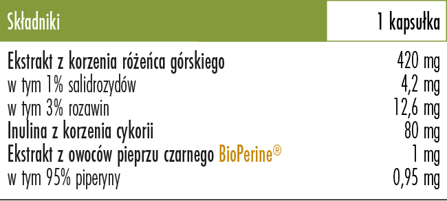 Składniki: Różeniec górski (Rhodiola rosea) ekstrakt standaryzowany na 1% salidrozydów i 3% rozawin, Inulina z korzenia cykorii, BioPerine® ekstrakt z owoców pieprzu czarnego standaryzowany na 95% piperyny, otoczka kapsułki: hydroksypropylometyloceluloza.