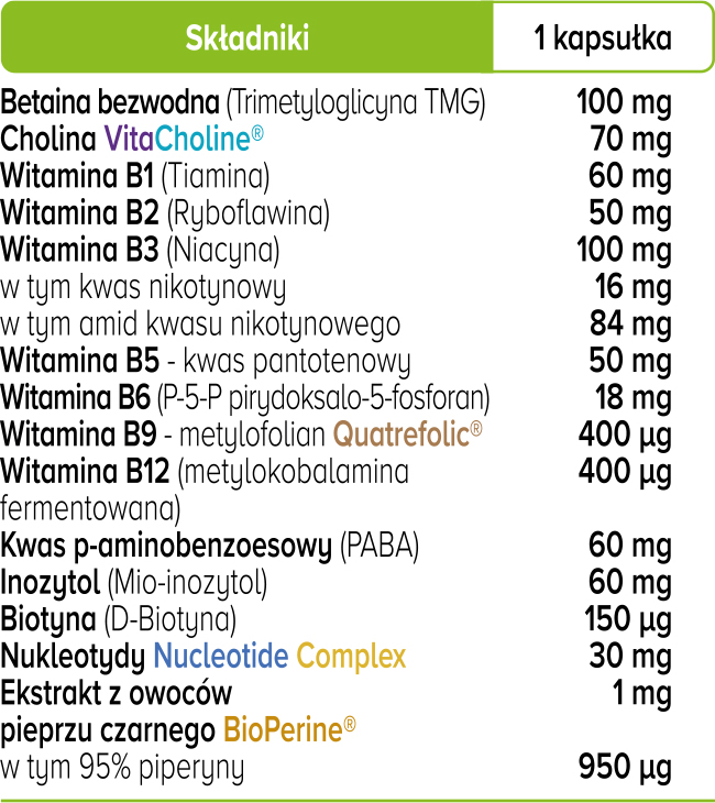 - zawiera TMG oraz metylowane aktywne formy witaminy B,